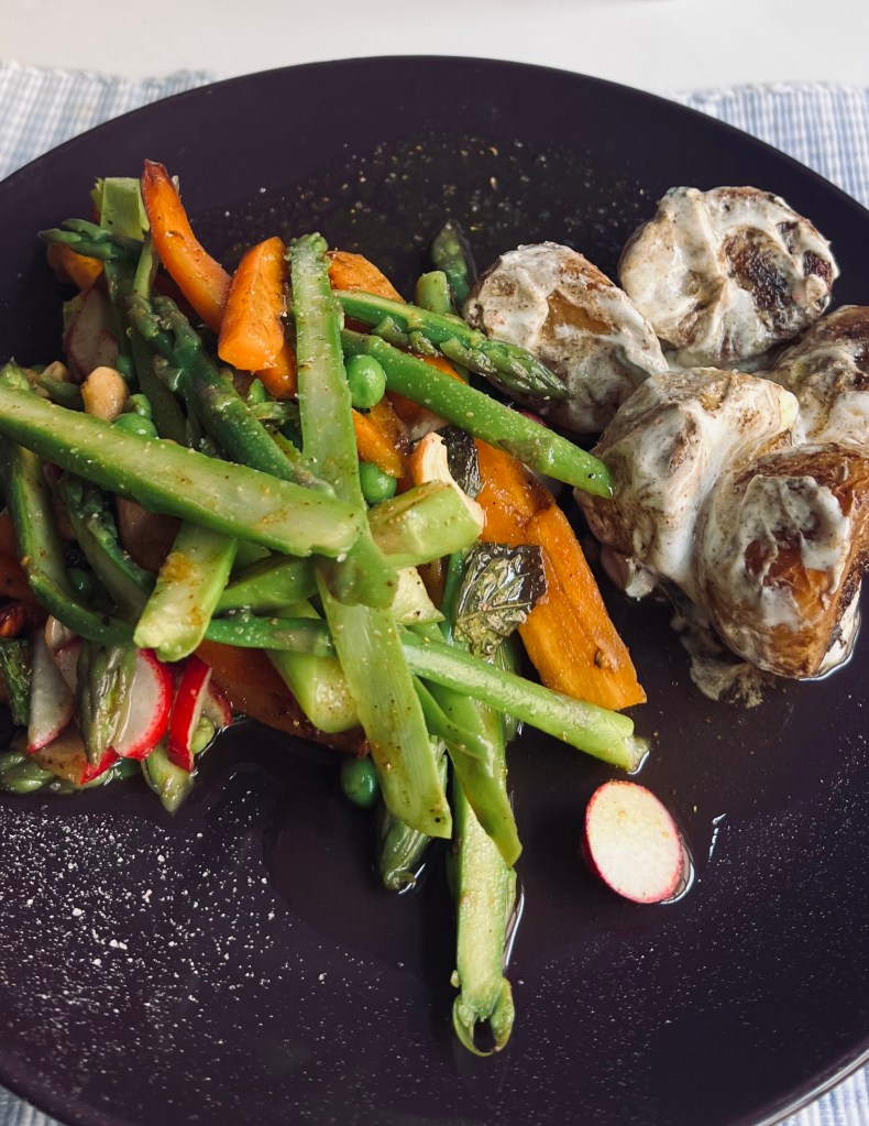 In case the food in the photo looks at all appetizing to you, I made the Crunchy Aparagus, Carrot, and Hazelnut salad as well as the Spiced New Potatoes with Minty Yogurt Dressing from Deliciously Ella- The Plant Based Cookbook. While my efforts tasted fantastic, my presentation can definitely use some work.